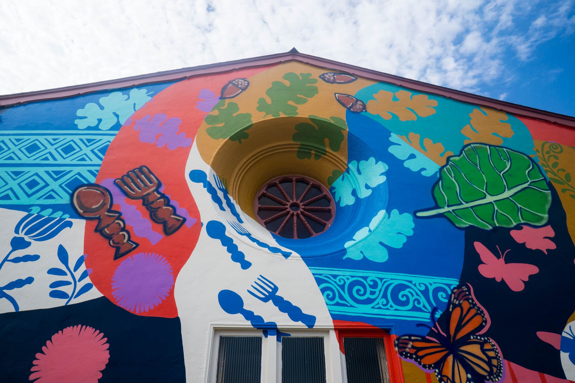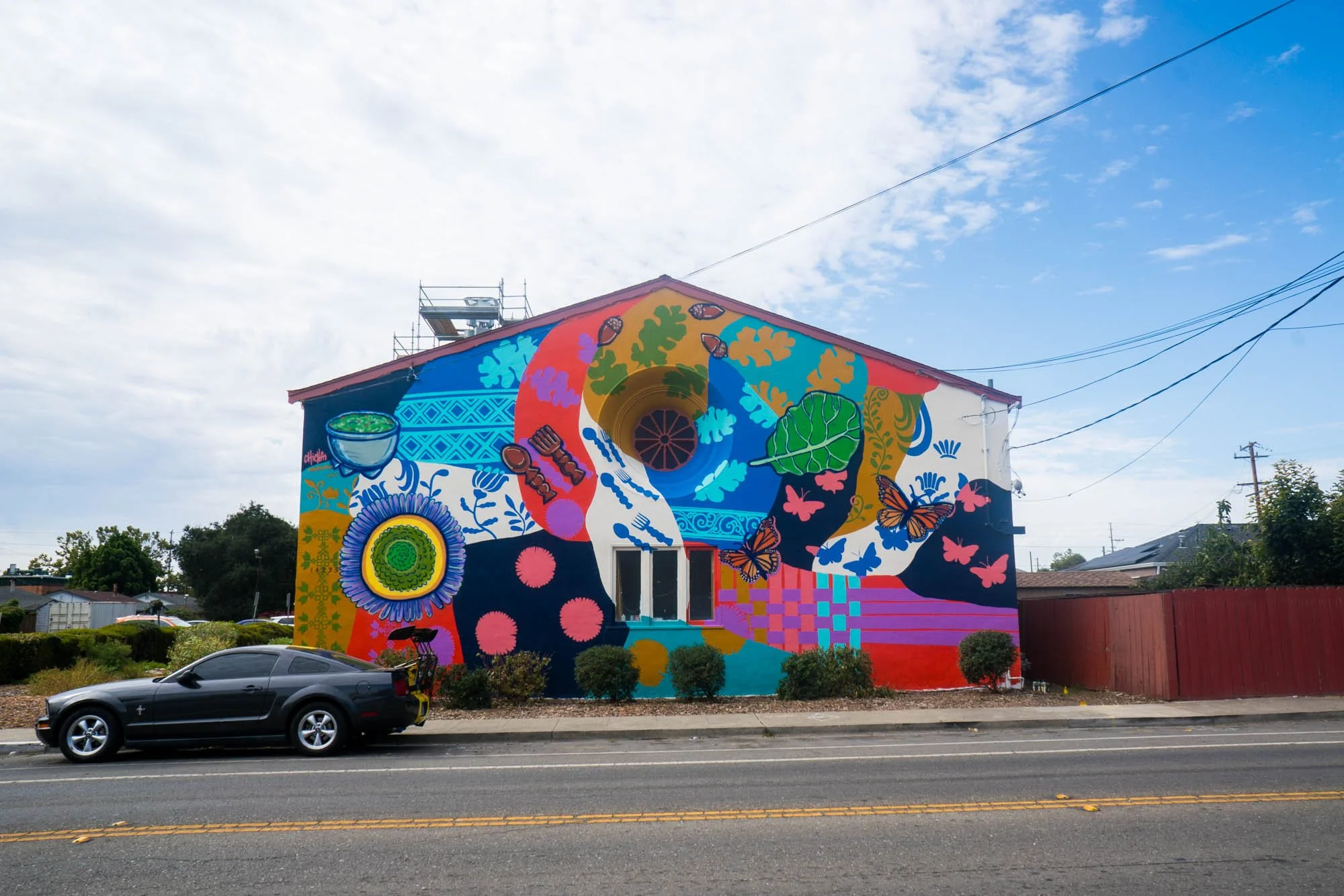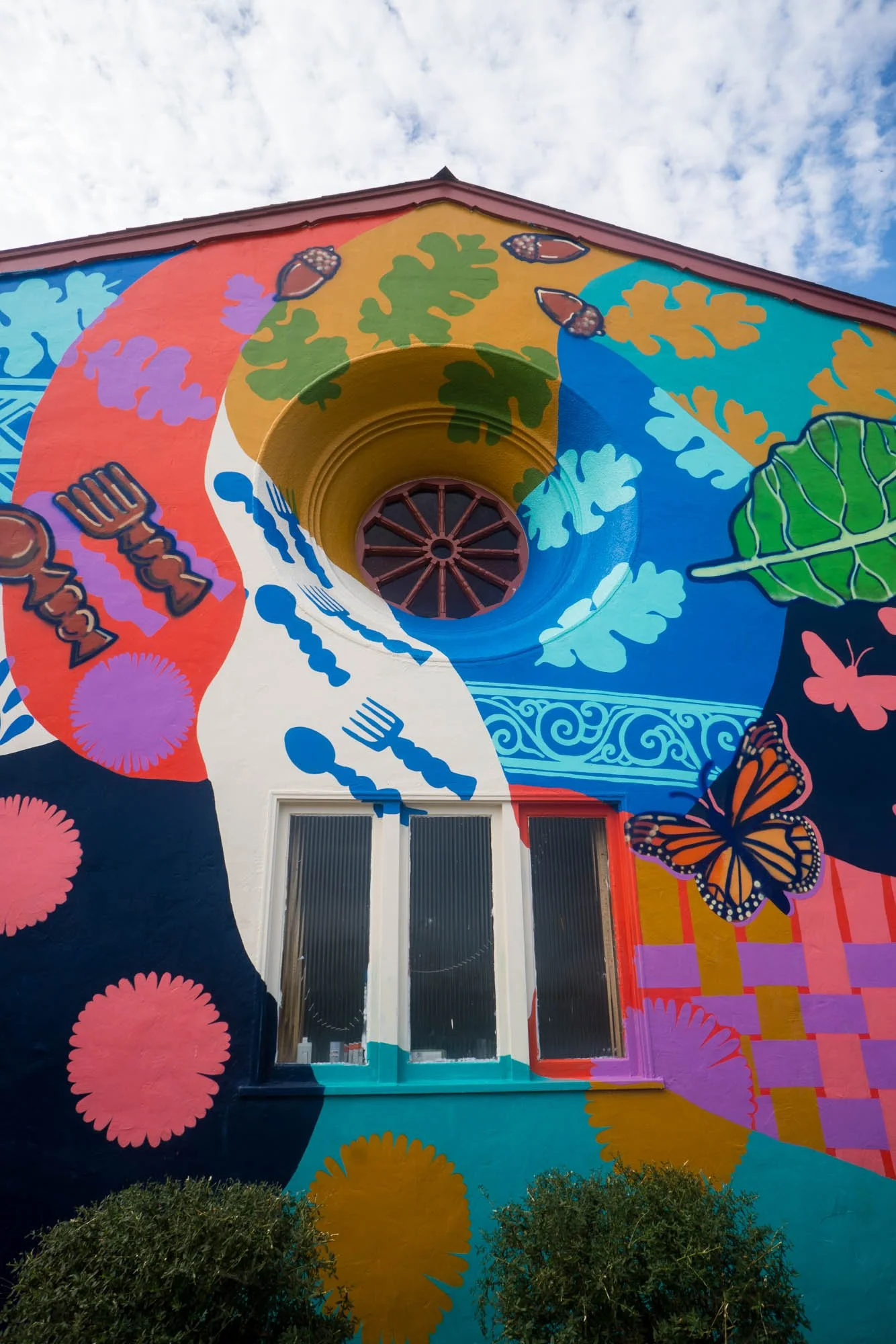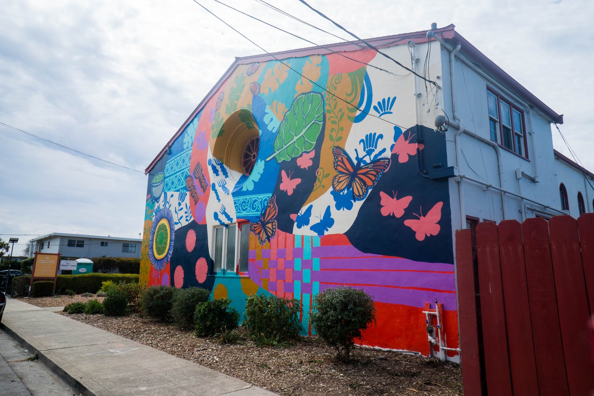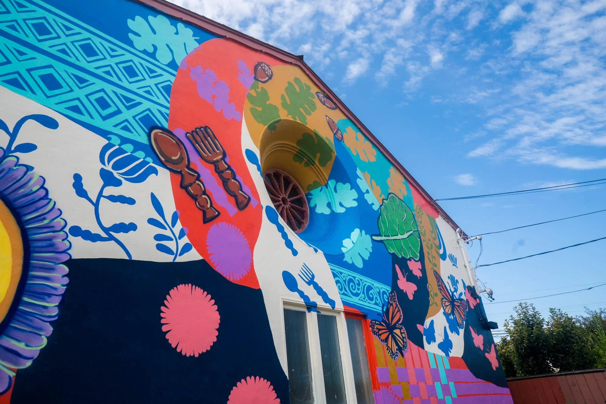 You will also find seaside daisies — on the mural as well as growing aside it— and native acorns to honor the Indigenous stewards of Ohlone Territory and their delicacies as well. Monarch butterflies fly atop the weaving and are a part of the tapestry as well; signs of a healthy environment for those migrating here.
