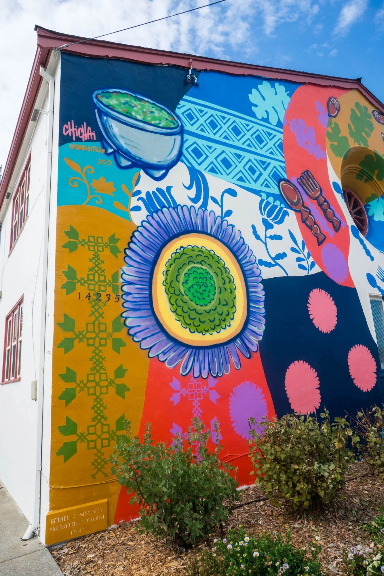 The patterns include tatreez (Palestinian embroidery,) otomi (Oaxaca, Mexico embroidery), patterns found in Chinese porcelain and pairs of wooden spoons and forks which are commonly found in Filipino households as decor. A molcajete filled with fresh foods and a vivid collard green are found atop, nods to cultural dishes served at the church.